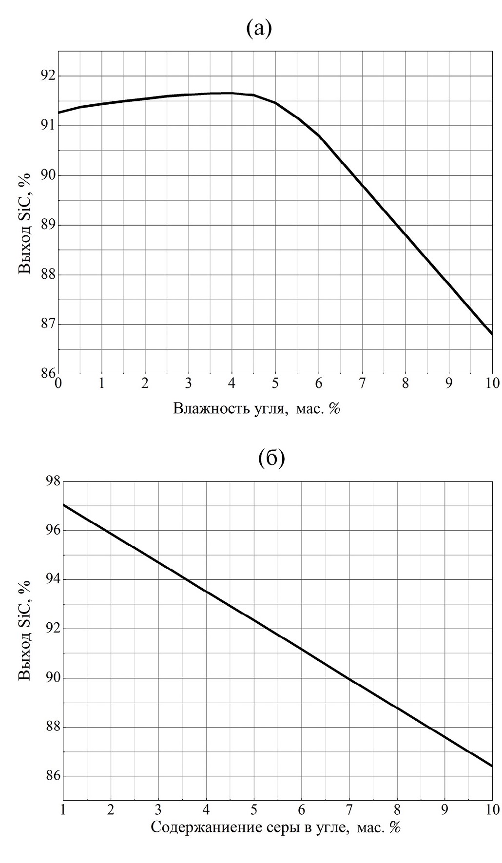 Максимальный выход наблюдается при влажности от 0 до 4%, в дальнейшем происходит резкое падение содержания карбида кремния в смеси. Это связано, по-видимому, с расходованием углерода по вышеприведенному механизму (рис. 2а). Расчеты полностью согласуются с методикой, представленной в [1], где указана необходимость предварительной сушки нефтекокса до содержания воды 3–4%, однако в литературе отсутствует обоснование данного эмпирического факта. Увеличение массовой доли серы приводит к монотонному снижению выхода карборунда, что, очевидно, объясняется увеличением содержания SiSг в системе (рис. 2б).