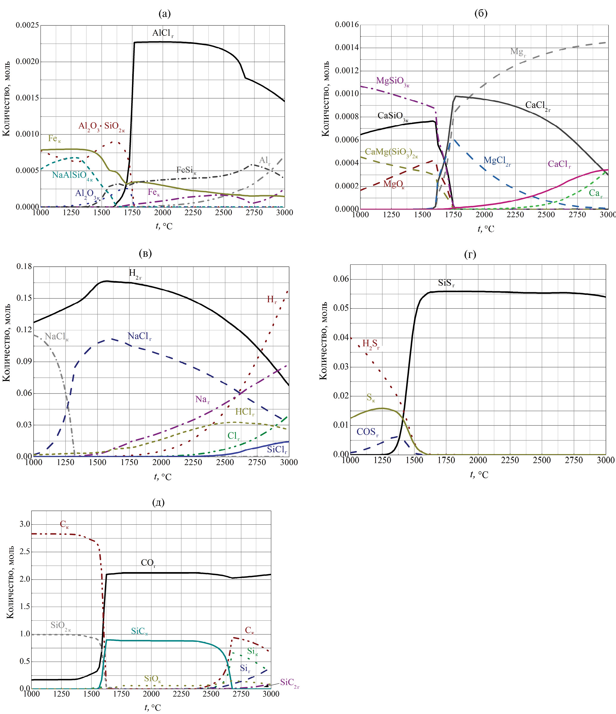 Рис. 3. Расчетное содержание соединений алюминия и железа (а), магния (б), серы, хлора и натрия (в), кальция (г), углерода и кремния (д) в реакционной смеси, содержащей 7% NaCl, в зависимости от температуры
