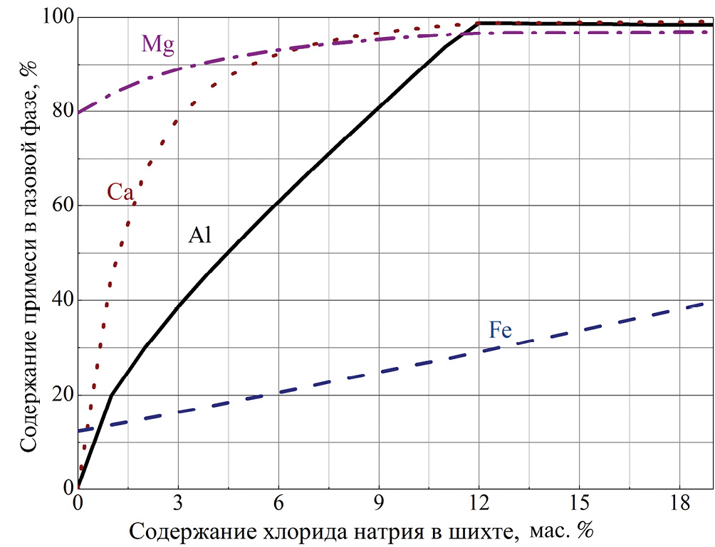 По результатам расчетов можно отметить, что наибольшее влияние увеличение концентрации хлорида натрия оказывает на соединения алюминия и кальция, при этом практически полное их удаление из конденсированной фазы наблюдается при содержании поваренной соли больше 12% для алюминия и 10% для кальция. Даже в отсутствие добавок степень удаления магния составляет 80%, в дальнейшем происходит монотонное возрастание до 96% при содержании хлорида натрия 11%. Наименее подвержены влиянию хлорида натрия соединения железа, однако степень их удаления при повышении содержания модификатора до 18% увеличивается в 3 раза.