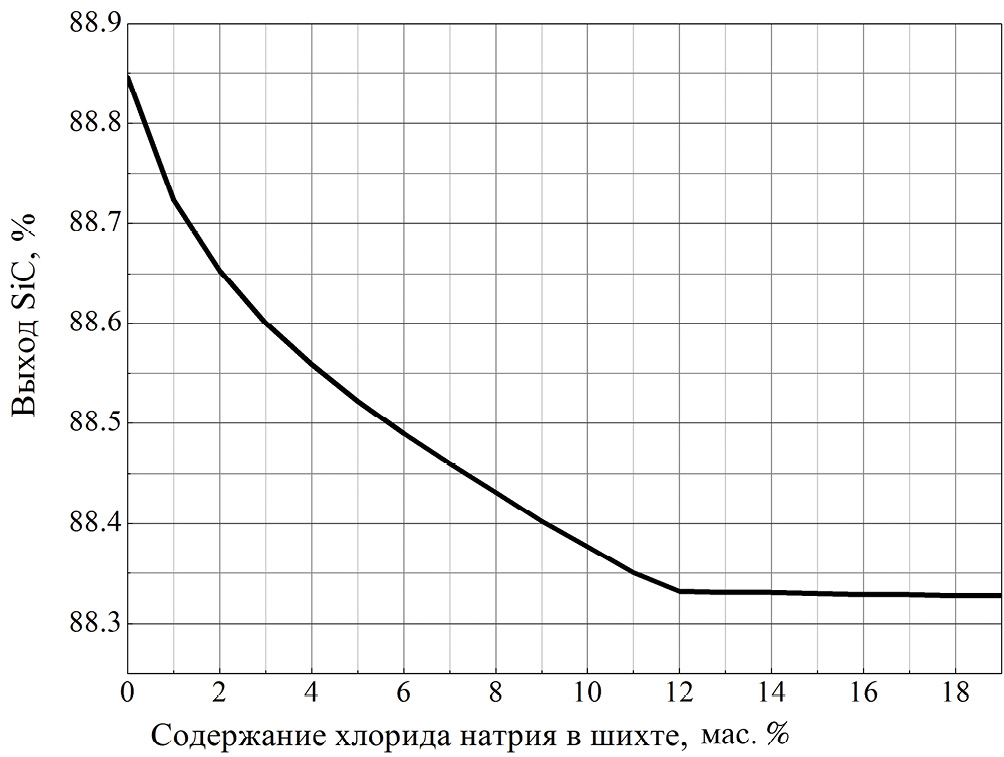 При производстве более чистого, “зеленого”, карбида кремния рекомендуется ввести в реакционную смесь 7 мас. % хлорида натрия [8]. В моделировании рассмотрено влияние этой добавки на состав продуктов.