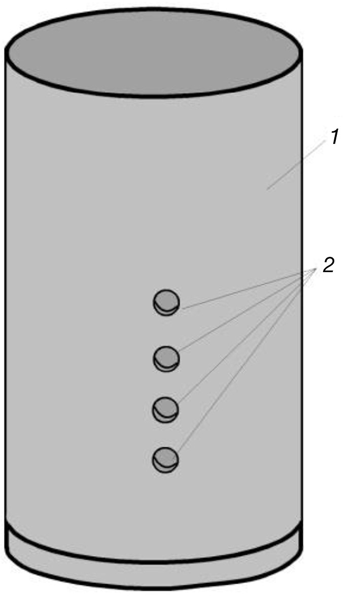 Процесс горения исследуемых смесей фиксировали на видеокамеру. Для возможности определения скорости горения на боковой поверхности графитовой формы (1) были сформированы четыре вертикально расположенных отверстия (2) с шагом в 1 см (рис. 1).