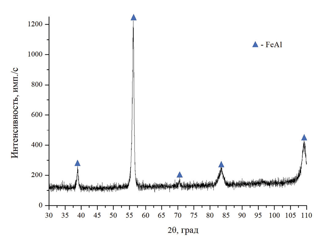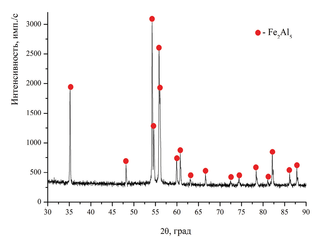 Попытка синтезировать однофазные литые алюминиды железа была предпринята в работе [17]. В качестве реагентов экзотермической смеси авторами был использован железо-алюминиевый термит с двухвалентным оксидом железа. В ходе проведенного исследования были синтезированы следующие интерметаллиды: однофазный FeAl, двухфазные FeAl + FeAl2, FeAl2 + Fe2Al5 и трехфазный FeAl2 + Fe2Al5 + Fe4Al13.