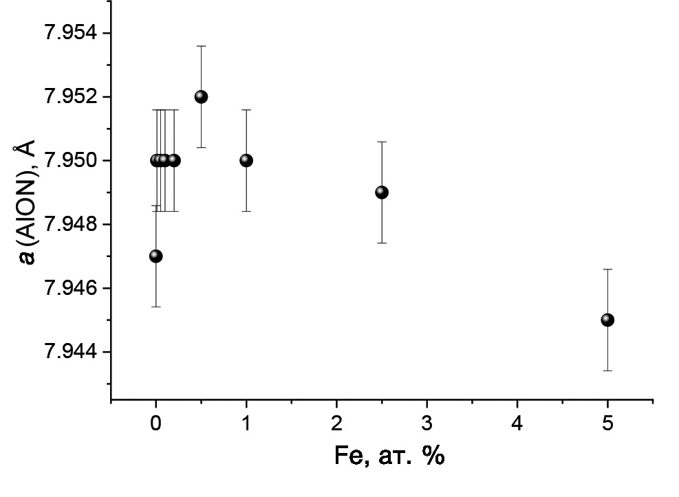 Параметры кристаллической решетки основной фазы AlON в синтезированных образцах были уточнены с помощью пакета Profex [22] методом Ритвельда. При аппроксимации дифрактограмм критерий χ2 не превышал значения 2.5 без учета пиков от неидентифицированных фаз НФ1 и НФ2. В результате оценки выявлено, что при увеличении концентрации железа в исходной смеси постоянная решетки оксинитрида алюминия закономерно уменьшается с 7.950 до 7.945 Å (рис. 2). Образец AlON:0Fe не подчиняется данной зависимости предположительно из-за отличий в стехиометрическом составе, на что указывает присутствие фазы α-Al2O3. Уменьшение постоянной решетки при увеличении содержания железа может быть связано с тем, что ионы железа занимают вакансии алюминия VAl, а не замещают ионы Al3+. В работе [23] в рамках модели кристаллической структуры γ-AlON c полностью заполненными анионными позициями (модель постоянных анионов) показано, что заселенность позиций алюминия заметно ниже 1, причем большая часть дефектов VAl приходится на октаэдрические позиции 16d, которые наиболее выгодны для ионов железа при их внедрении в шпинельную структуру. Появление дополнительных катионов в этих позициях, возможно, приводит к уменьшению постоянной решетки, что, однако, требует дополнительных исследований.