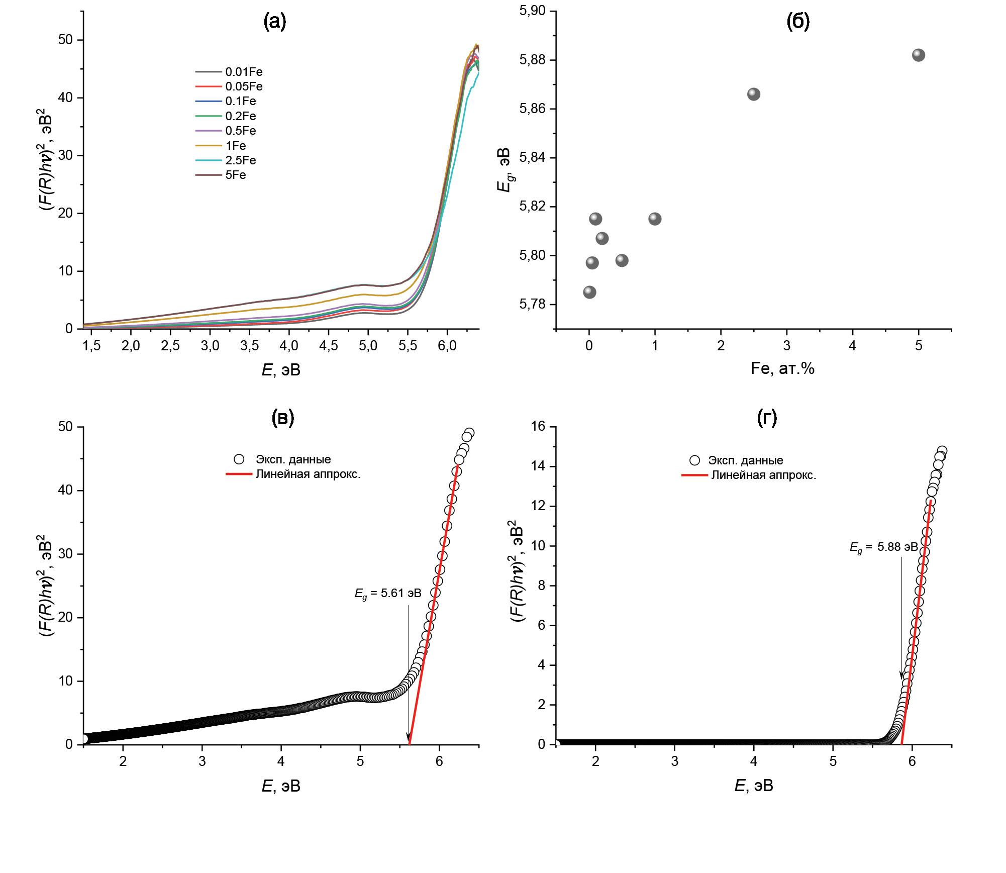 Значения Eg, вычисленные для всех образцов, представлены в графическом виде на рис. 5б. Видно, что в диапазоне концентраций железа 0.01–1.0 ат. % величина Eg лежит в диапазоне 5.76–5.82 эВ. При дальнейшем увеличении концентрации железа Eg возрастает до 5.87–5.88 эВ.