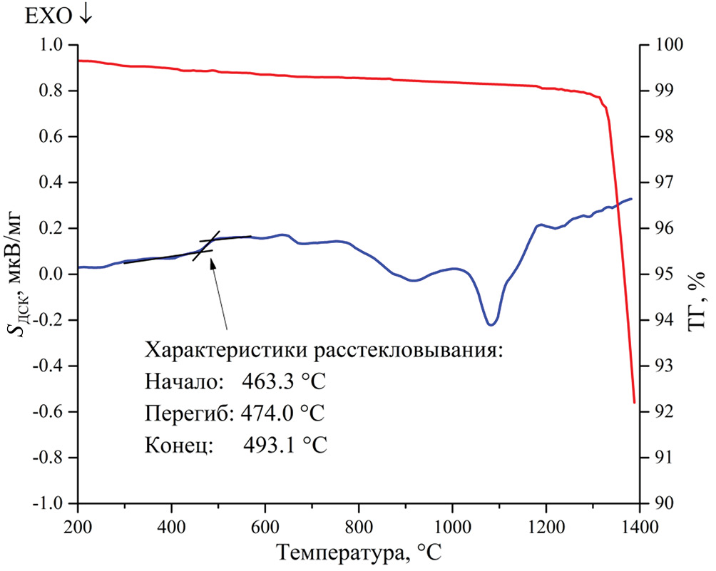 Термический анализ стекол и полученных образцов стеклокерамики выполнялся на синхронном термоанализаторе Netzsch STA 409 PC Luxx (Germany), что позволило изучить процессы, протекающие при формировании стеклокерамики. Измерения проводили в платиновых тиглях при скорости нагревания 10°С/мин в потоке очищенного аргона с суммарным расходом 80 мл/мин. Методика работы и калибровки по температуре и чувствительности подробно изложена в Netzsch Software Proteus.
