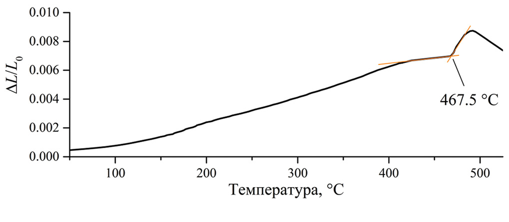 Дилатометрическая кривая одного из полученных стеклокристаллов показана на рис. 4. Отмечена температура резкого изменения вязкостных свойств стеклокристалла, которая коррелирует с температурой расстекловывания (см. табл. 1).