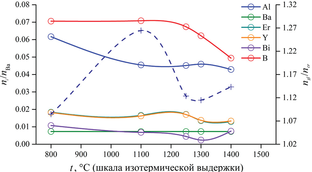 Рис. 5. Число элементов (ni) в стеклокерамике относительно nBa в зависимости от температуры синтеза (пунктирная линия — отношение содержаний стекла и кристаллической фазы ngl/ncr)