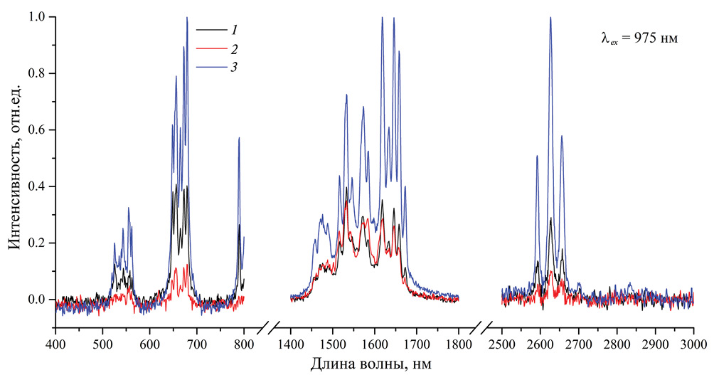 При измерении спектров возбуждения люминесценции в образцах стеклокристаллов, полученных методом пропитки, обнаружена ап-конверсионная (антистоксовая) люминесценция в диапазоне длин волн 450–750 нм. Расширенный пик в области 1500–1650 нм обусловлен наличием атомов Er и Bi. Кроме того, наблюдается люминесценция в области 2550–2700 нм. Таким образом, из одного канала с длиной волны 975 нм получается несколько (рис. 8).