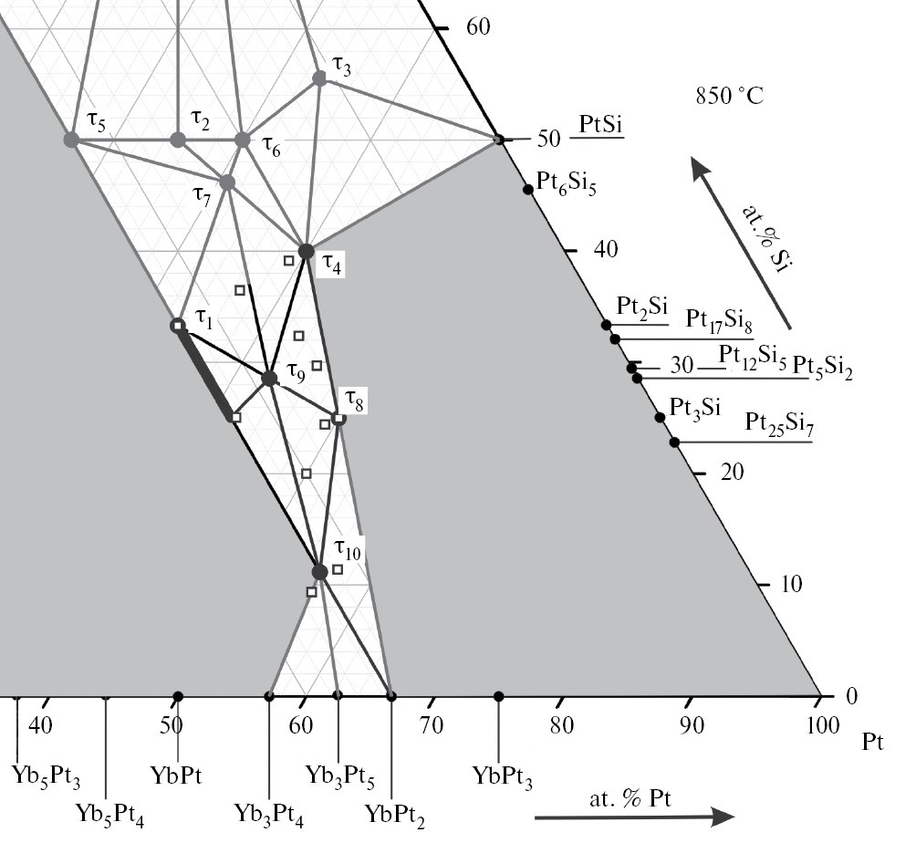 По литературным данным, в системе Yb–Pt–Si существует десять тройных интерметаллидов: YbPtSi, Yb3Pt23Si11, YbPt2Si2, Yb2Pt3Si5, YbPtSi2, YbPt2Si, Yb3Pt4Si6, Yb11Pt33Si56, Yb33Pt17Si50, Yb18Pt51.1Si15.1 [9–16]. У первых четырех из них обнаружены упомянутые ранее физические свойства, в том числе: антиферромагнитный фазовый переход у YbPtSi [9], парамагнетизм у Yb3Pt23Si11 [10], флуктуации валентности атомов иттербия в YbPt2Si2 [11], неферми-жидкостное поведение у Yb2Pt3Si5 [12]. Кроме этих сведений о физических свойствах отдельных ИМС, ранее сообщалось о фазовых равновесиях и кристаллографических данных соединений в системе Yb–Pt–Si в области содержания кремния от 33 до 100 ат. % [14].