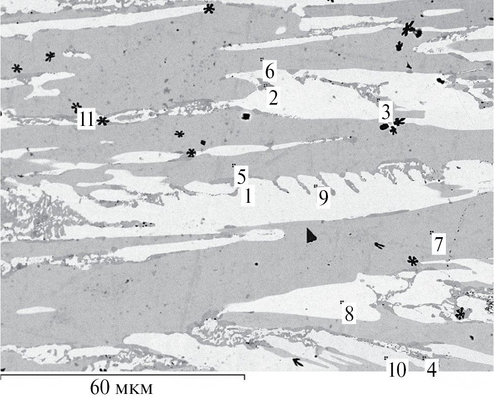 На рис. 2 и 3 в виде СЭМ-изображений показаны микроструктуры двух образцов из трехфазных областей равновесий τ8–τ9–τ10 и τ4–τ8–τ9 (присутствие фазы τ9 во втором сплаве установлено методом РФА). Цифрами отмечены точки, в которых проводились замеры концентраций.