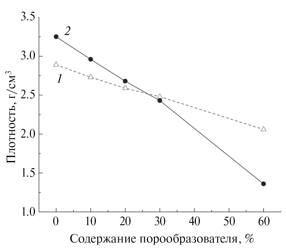 Спрессованные заготовки подвергали отжигу для удаления порообразователя NH4HCO3 и дегидрирования TiH2. Отжиг проводили в вакууме (остаточное давление около 10 Па) по режиму: нагрев до 100 °С за 50 мин, далее без выдержки нагрев до 800 °С за 30 мин, выдержка при этой температуре 120 мин, охлаждение с печью. В результате отжига в процессе нагрева до 100 °С происходило разложение порообразователя с выделением газообразных продуктов по реакции NH4HCO3 → NH3 + H2O + CO2. Дальнейший нагрев с выдержкой при 800 °С приводил к выделению водорода из гидрида титана по реакции TiH2 → Ti + H2 [34]. Таким образом получались слабо спеченные и потому непрочные пористые титановые заготовки, которые далее подвергались окончательному спеканию при более высокой температуре. На рис. 2 представлены зависимости плотности прессовок и образцов после отжига при 800 °С от содержания порообразователя.