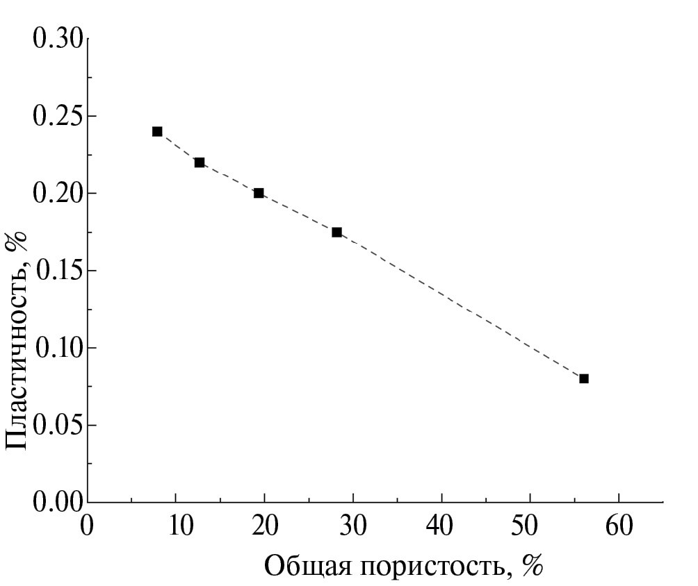 Рис. 7. Зависимость пластичности от общей пористости образцов, спеченных в аргоне при 1200 °С