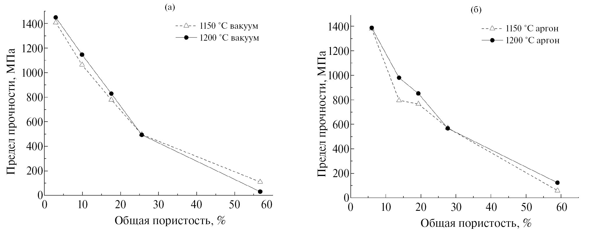 Рис. 8. Зависимости предела прочности на сжатие от общей пористости: а – спекание в вакууме; б – спекание в аргоне