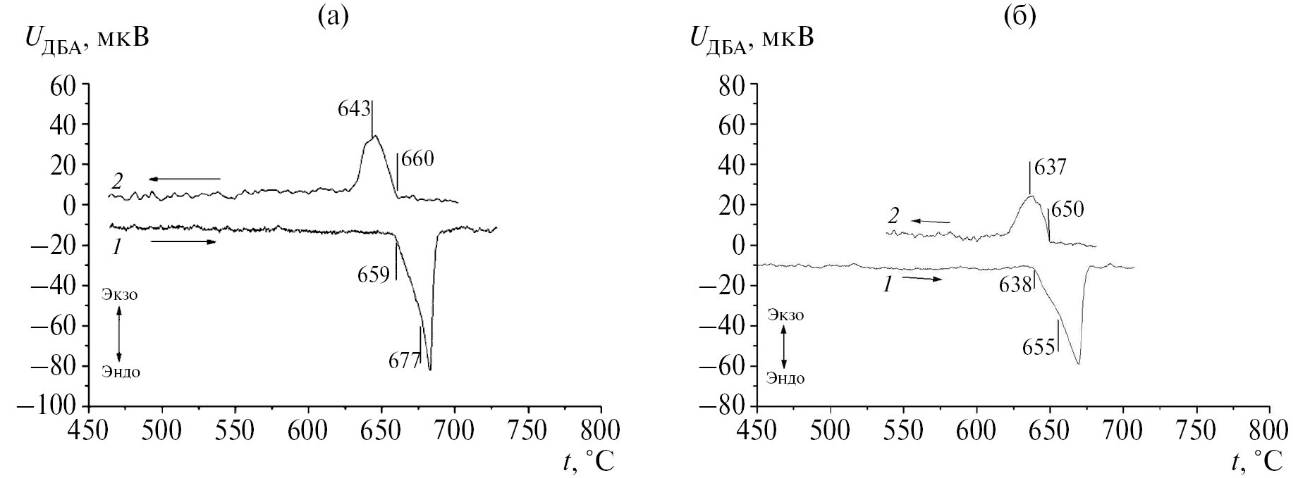 Рис. 3. ДБА-кривые плавления–кристаллизации при давлении 100 МПа двойных сплавов Al–4Zn (а) и Al–9Zn (б): 1 – кривые нагрева, 2 – кривые охлаждения