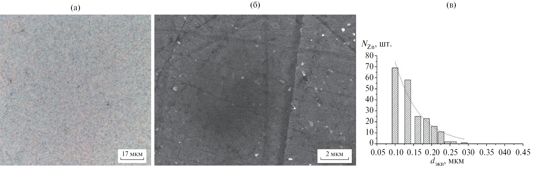 Рис. 6. Микроструктура (а, б) и гистограмма распределения частиц Zn по размерам (в) сплава Al–4Zn после БТО