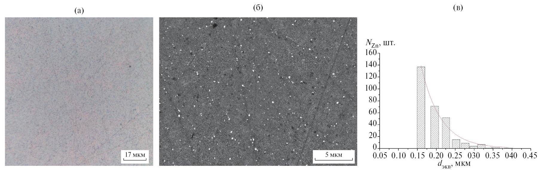 Рис. 7. Микроструктура (а, б) и гистограмма распределения частиц Zn по размерам (в) сплава Al–9Zn после БТО (90 МПа/460 °С/3 ч): а – ОМ, б – СЭМ