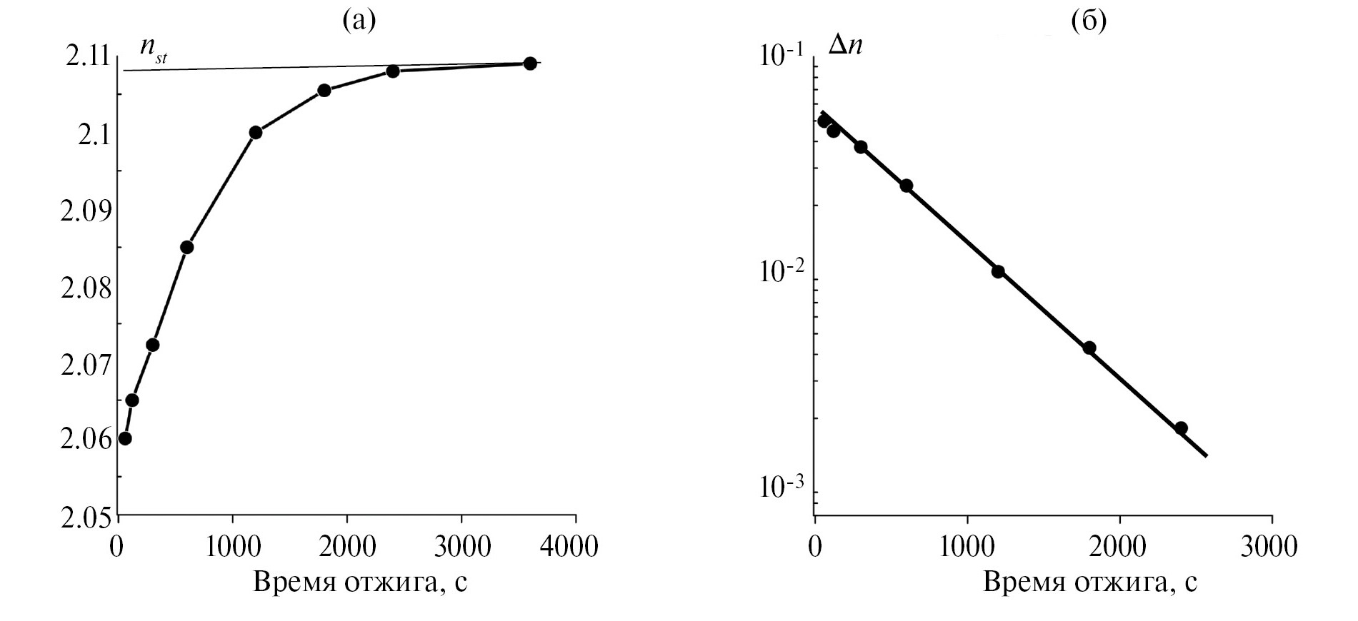 где nst – стационарное значение показателя преломления после длительного отжига; τ(Т) – постоянная времени кинетического процесса, зависящая от температуры отжига.
