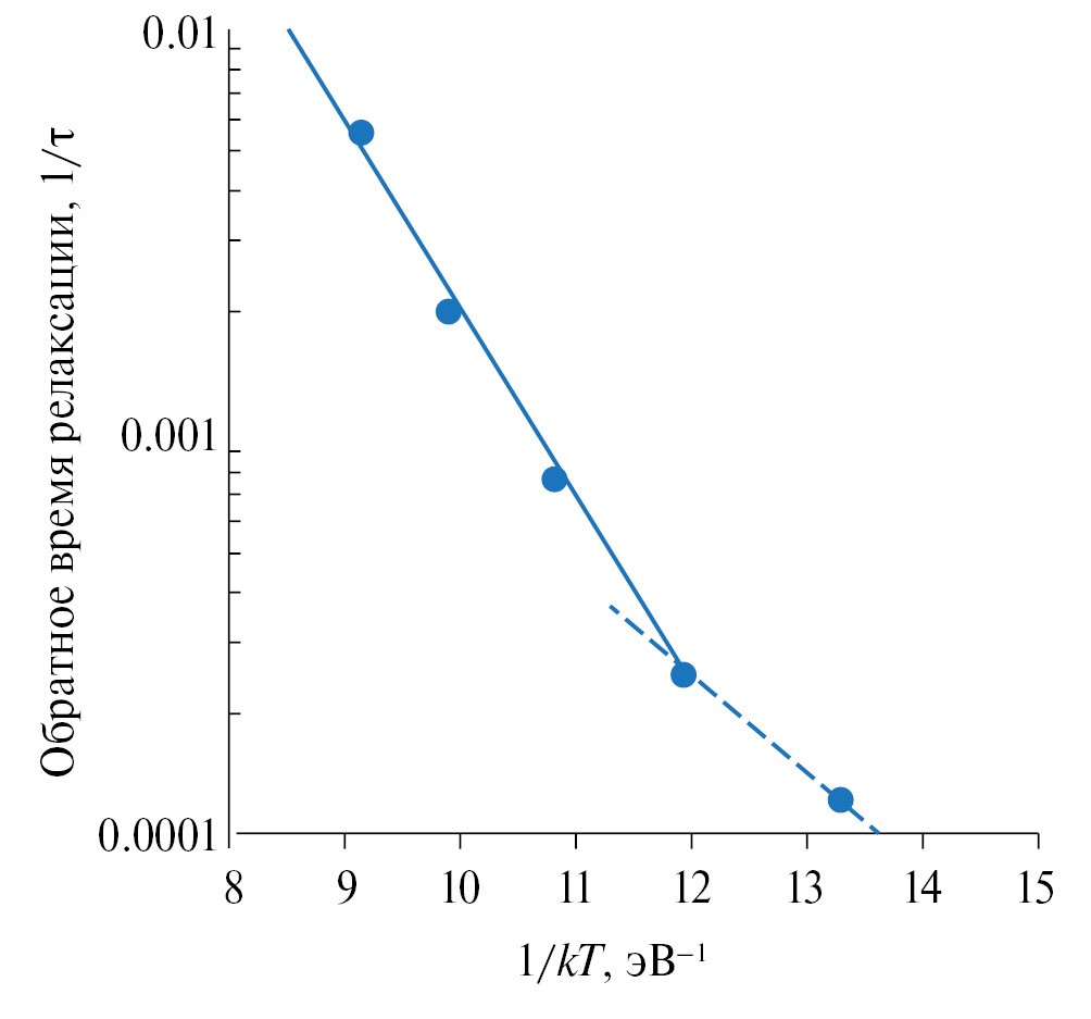 Показатель преломления характеризует оптическую плотность вещества. Увеличение показателя преломления указывает на ее увеличение. При этом показатель преломления стремится к величине 2.11, которая соответствует показателю преломления монокристалла с составом, близким к стехиометрическому. Можно сделать вывод, что увеличение показателя преломления связано как с кристаллизацией пленки, так и с приближением ее состава к стехиометрическому при отжиге в атмосфере кислорода. Для определения постоянной времени изменение показателя преломления Δn = n∞ – n(τ) строилось в полулогарифмических координатах как функция от времени при каждой температуре отжига. Зависимость величины, обратной постоянной времени, которая соответствует вероятности протекания процесса, строилась от обратной термодинамической температуры Θ = kT (эВ), определенной как энергия процесса кристаллизации, показана на рис. 3. Зависимость имеет два участка с различными энергиями активации. При более низких температурах энергия активации равна 0.6 эВ, а при более высоких – 1.1 эВ.