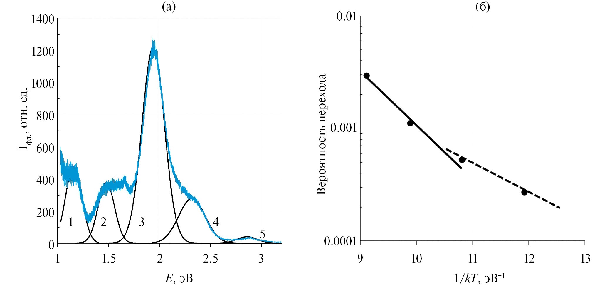 Рис. 4. Спектр ФЛ пленок оксида гафния, отожженных в кислороде при температуре 700 °С (полосы 1–5 экспериментального спектра аппроксимированы функциями Гаусса) (а); температурная зависимость вероятности перехода (б)