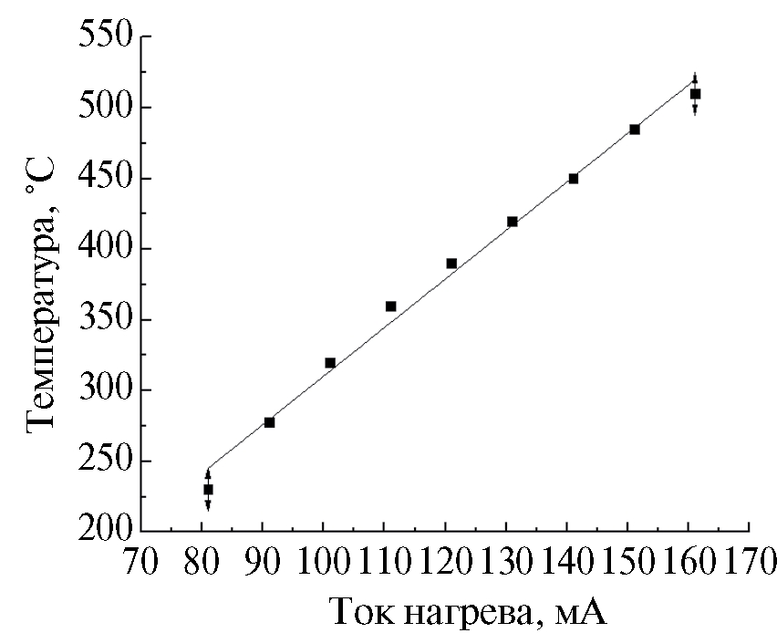 Сенсорный отклик в различных условиях изучали с помощью проточной камеры с расходом газа ~ 2 л/ч (поверочные смеси CH4 + воздух (0.5 об. %, 5000 ppm), NO2 + воздух (0.00152 об. %, 15.2 ppm). Рабочий ток подавался от источника постоянного тока Б5‒49; условия измерения и параметры сенсора контролировались мультиметром Б740/4. Измерялось напряжение на токоподводах сенсора при различных токах на воздухе, затем сенсор помещался в газовую камеру и напряжение измерялось при различных токах нагрева в газовоздушной среде. Выходной сигнал одноэлектродных сенсоров определялся по формуле (1). Время срабатывания соответствует времени достижения максимального сигнала, а время восстановления – времени полного возврата к исходному значению напряжения. Оба параметра определялись при помощи секундомера. Температуру чувствительных элементов одноэлектродных сенсоров измеряли с помощью лазерного пирометра с микроцелеуказателем Impac IN140 (Luma Sense Technologies). Отклик сенсоров измерялся в диапазоне 80–160 мА (~ 220–500 °С). На рис. 1 представлено соответствие тока нагрева температуре чувствительного элемента (коэффициент корреляции 0.99079).