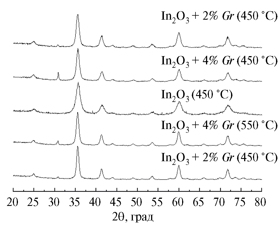 Получение композита In2O3/графен. Для получения композита In2O3/графен использовали суспензию графена в растворе нитрата индия, которую постоянно перемешивали. Дальнейшая процедура проводилась аналогично приготовлению геля In(OH)3. Смесь гель+порошок высушивали в сушильном шкафу при 120 °С до образования ксерогеля. Конечный порошок композита In2O3/графен готовили обжигом ксерогеля при 450 °С в течение 2 ч или при 550 °С в течение 2 ч с последующим ручным помолом в ступке.