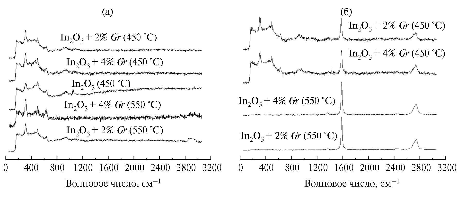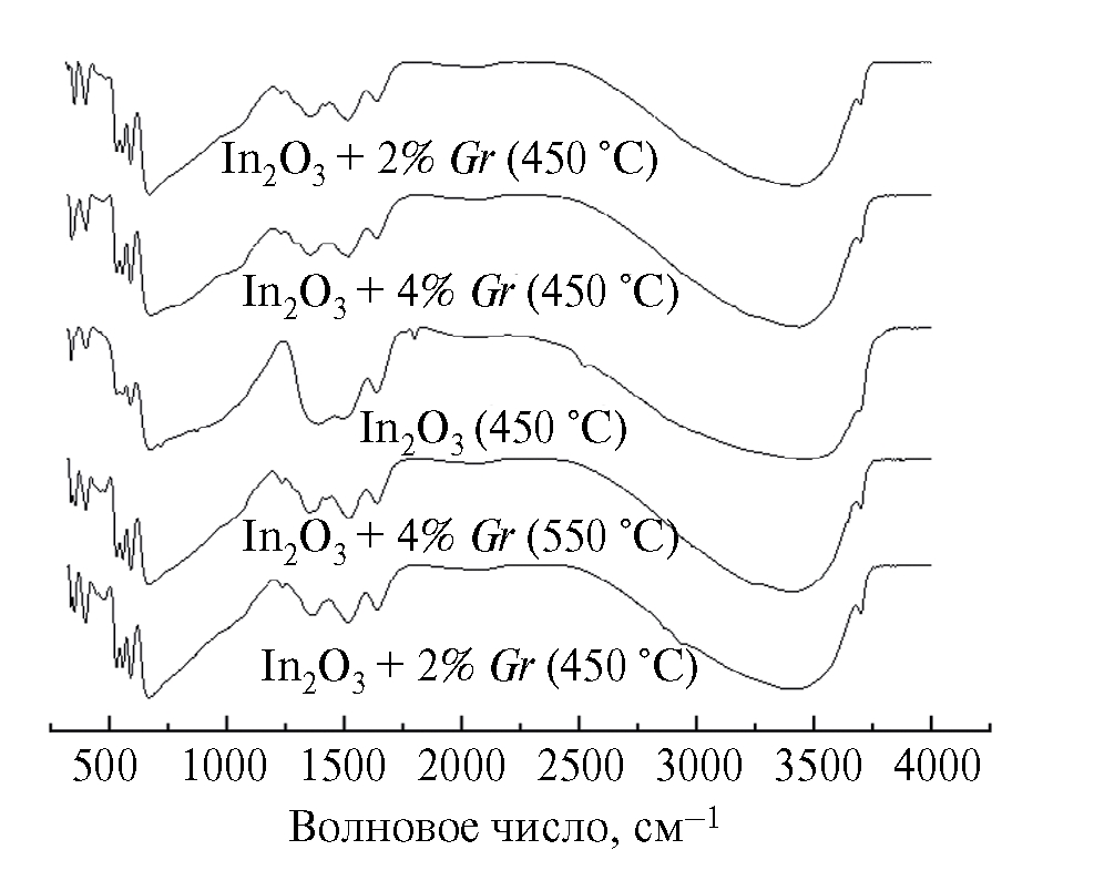 Спектры исследованных порошков схожи, но в зависимости от количества графена и температуры обжига форма и интенсивность пиков незначительно различаются. Структурные отличия индивидуального оксида индия от композита оксида индия с графеном проявляются в изменениях формы и интенсивности пиков при 450‒700 см‒1 что обусловлено изменением длин связей In—O, а также появлением структурных дефектов и образованием кислородных вакансий.