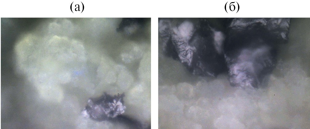 На рис. 5 представлены полученные при помощи спектрометра КРС фотоизображения композитов оксида индия с графеном (по оси абсцисс примерно 120 мкм). Хлопья темного цвета относятся к фазе графена, светлая зернистая структура – оксид индия.