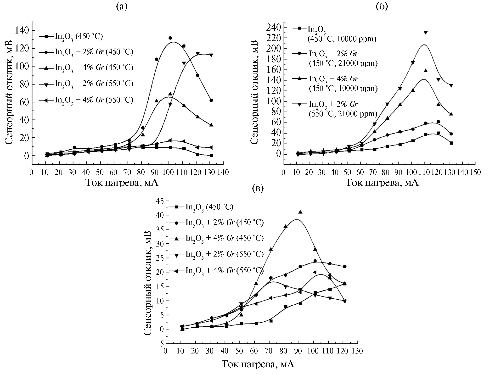 По второму способу сенсор помещают в камеру с искусственным воздухом и в камеру с испытуемой смесью, при этом записываются значения напряжения при каждом токе нагрева отдельно в каждой камере. Результат расчета величины отклика по формулам (1) или (2) для всех известных сенсоров на основе оксидных композитов, а также для индивидуального оксида индия в обоих случаях практически совпадает. Однако для сенсоров In2O3/графен в случае измерений по первому способу (использован в данной работе) отклик оказывался значительно выше. Данный эффект отражает, вероятно, особенности электронного переноса в графеновой фазе. На практике это означает необходимость использования специальных режимов нагрева (когда перед снятием показаний сенсор разогревается меняющимся постоянным током), в частности метода импульсного нагрева, с целью получения наиболее высокого сигнала сенсора.
