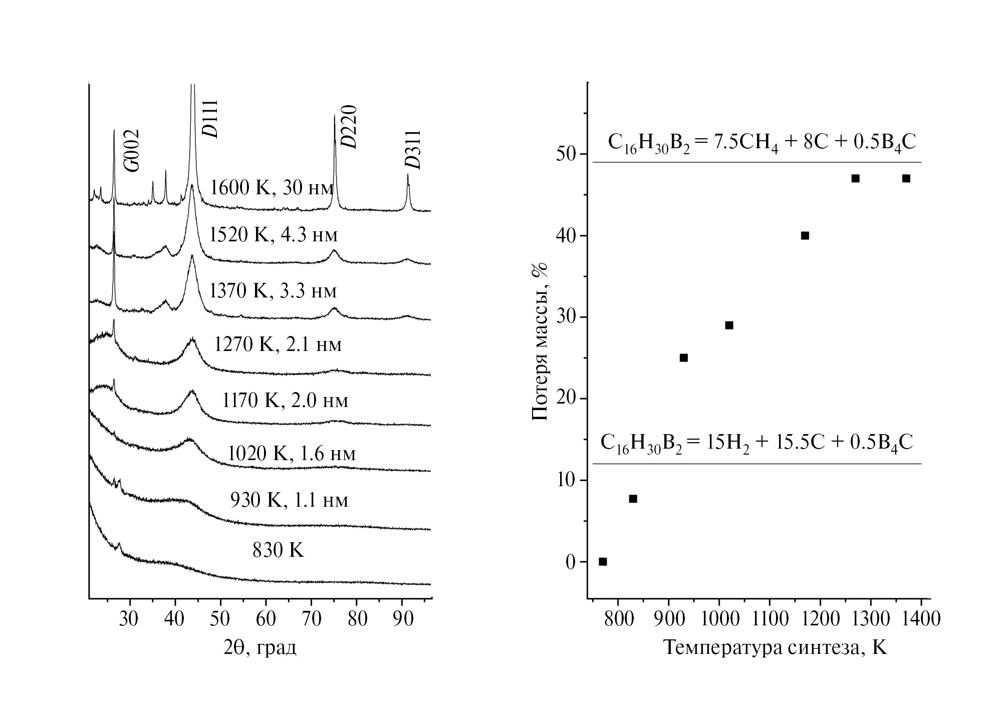 После синтеза при 1170–1270 K на рентгеновских дифрактограммах образцов наблюдаются широкие пики при 26°, 44°, 75° и 77°, свидетельствующие о формировании смеси нанокристаллических фаз алмаза и графита в образце (рис. 1а). Рассчитанные по формуле Селякова–Шеррера значения средних размеров наноалмазов и нанографита по пикам 111 и 002 соответственно составляют около 2 нм. Появление нанографита в области стабильности алмаза можно объяснить «проскакиванием» наиболее благоприятного для «наноалмазной» полимеризации температурного интервала и интенсификацией реакций пиролиза с образованием углеводородов; потеря около 50% массы прекурсора после эксперимента при 1270 K прямо указывает на преимущественное формирование летучих соединений водорода с углеродом и бором.