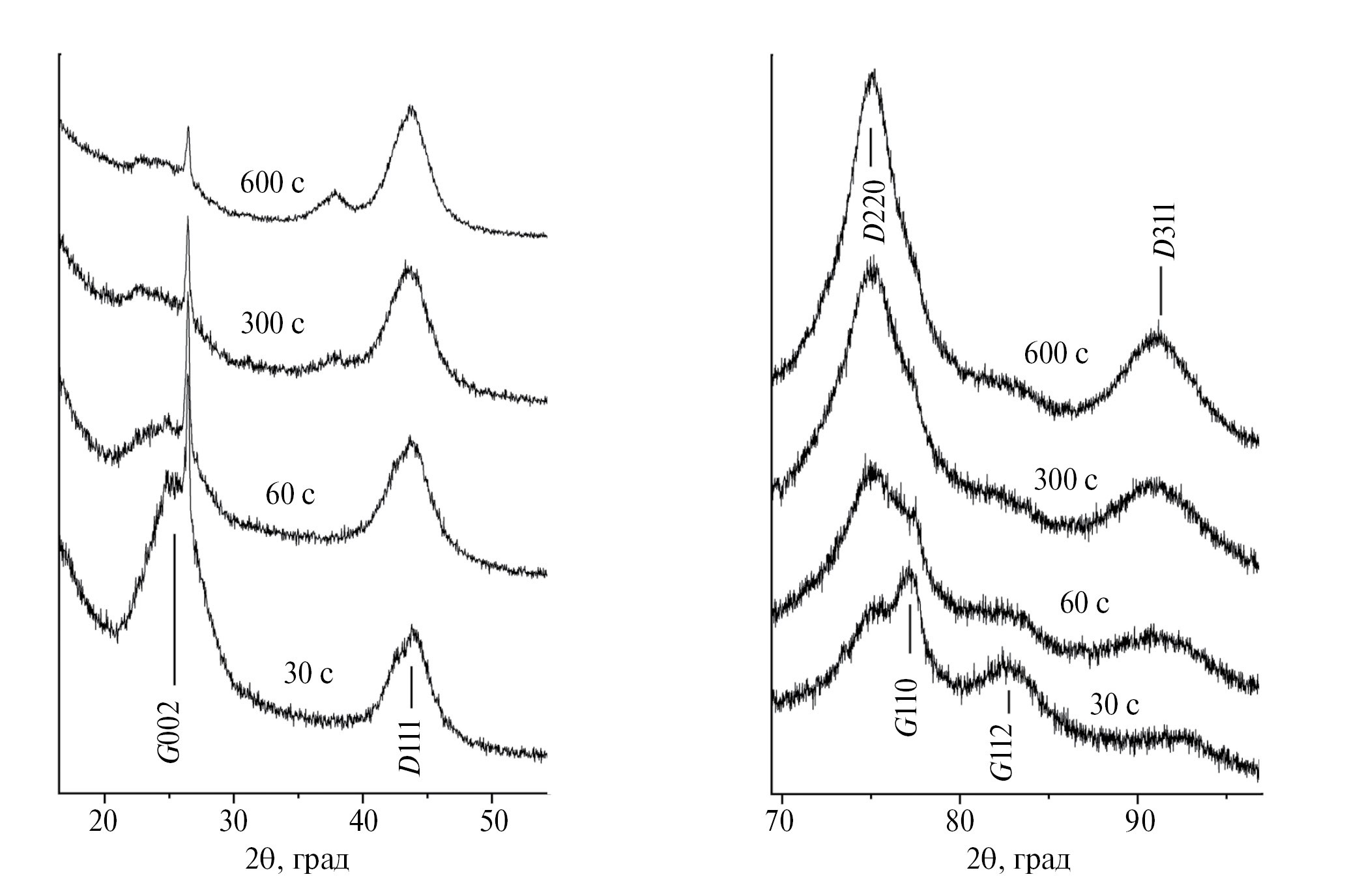 Для выявления особенностей трансформации sp2–sp3 нанокристаллической смеси мы исследовали влияние времени синтеза при температуре 1270 K на фазовый состав образцов (рис. 3). Результаты анализа дифрактограмм с использованием метода Ритвельда позволили охарактеризовать эволюцию наноструктуры и кинетику превращения. На рис 4 представлены зависимости массовой доли и размера кристаллитов графитоподобной и наноалмазной фаз от времени синтеза (образование сопутствующих фаз не принималось в расчет). Размеры кристаллитов оценивались по пикам 220 алмаза и 002 графита. Степень превращения нанографита в наноалмаз хорошо коррелирует со средним размером нанокристаллов алмаза, что в целом соответствует ростовому процессу. Отметим, однако, что рост наноалмазов ограничен размерами графеновой оболочки, окружающей «алмазный» кластер.