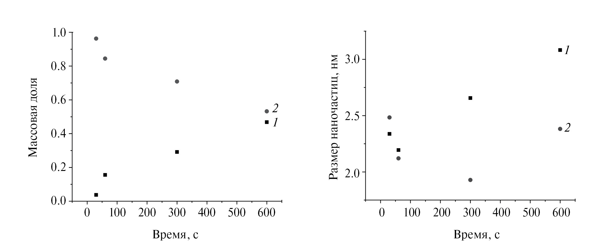 Рис. 4. Зависимости массовой доли (а) и размеров кристаллитов (б) нанографита (2) и наноалмаза (1) от времени синтеза при температуре 1270 K.