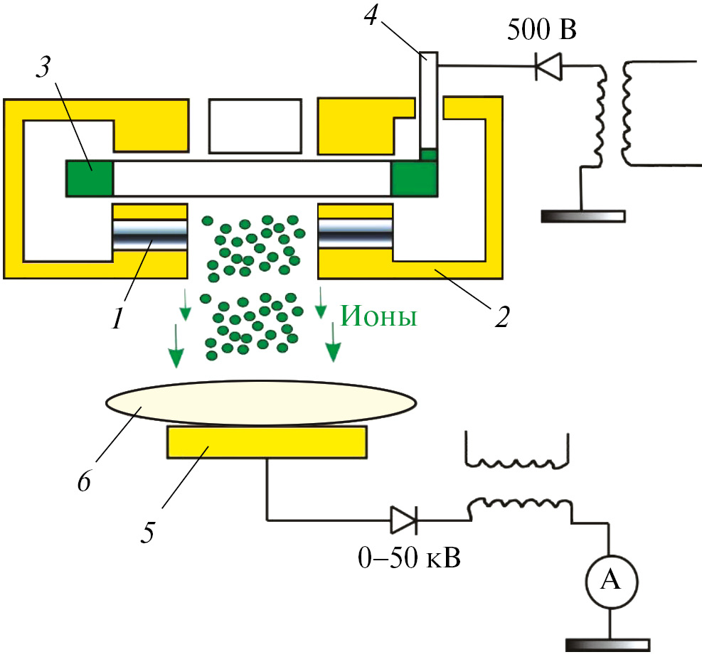 Рис. 4. Общая схема источника ионов с подачей потенциала на образец: 1 – магниты, 2 – катод, 3 – анод, 4 – ввод газа, 5 – столик для образцов, 6 – образец.