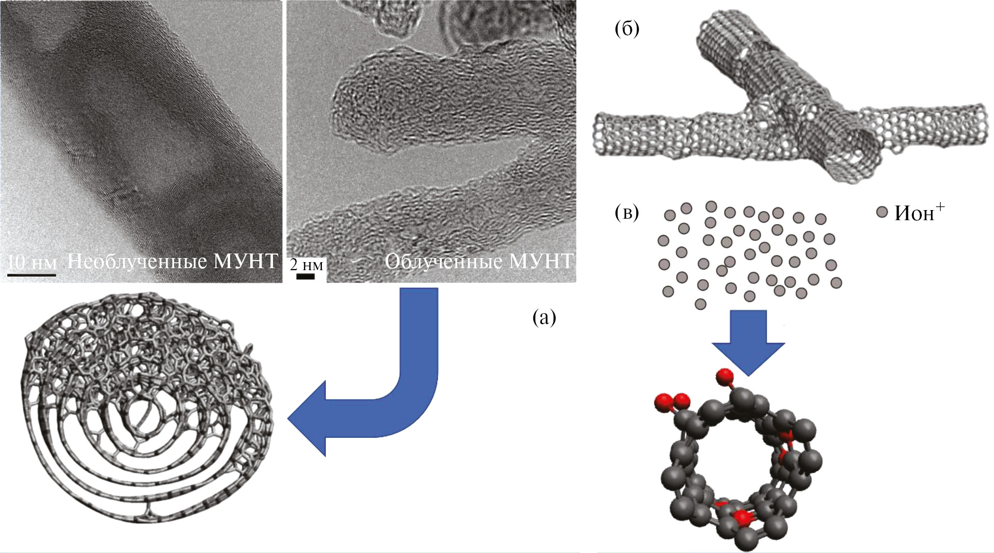 Рис. 5. Иллюстрация некоторых эффектов при облучении МУНТ ионными пучками: а – ПЭМ-изображения МУНТ до и после облучения ионами Ar+ (Е = 5 кэВ, Ф = 5х1016 ион/см2) и схематическое изображение области аморфизации в структуре МУНТ; б – сварка двух нанотрубок; в – фрагмент УНТ после ионного облучения и последующего контакта с окружающей средой, приводящих к присоединению кислородсодержащих групп (черные шарики – углерод, красные – кислород).