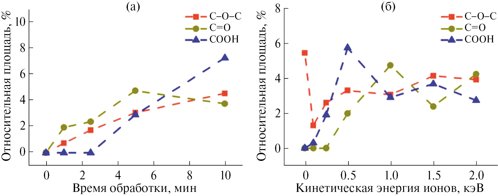 Рис. 6. Изменение относительной площади компонентов C1s-фотоэлектронного спектра вертикально ориентированных МУНТ, связанных с кислородом (C–O–C), (C=O) и (–COOH), в зависимости от времени обработки при энергии ионов 1 кэВ (а) и кинетической энергии ионов при времени обработки 5 мин (б) [104].