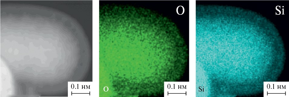 На увеличенном фрагменте ПЭМ-изображения частиц, синтезированных при 0°С (рис.7), видно, что ядро состоит из крупных кластеров с регулярно расположенными каналами, в оболочке размер структурных элементов значительно меньше (единицы нанометров). Видно, что между ядром и оболочкой имеются светлые области, вероятно, обусловленные наличием пор. На EDX-картах распределения Si, O в частицах, полученных при –20°C (рис. 8), также видно, что между оболочкой и ядром имеются более темные области размером в десятки нанометров. По-видимому, в данных областях находятся крупные мезопоры и вследствие этого содержание Si и O в них меньше, чем в ядре и оболочке.
