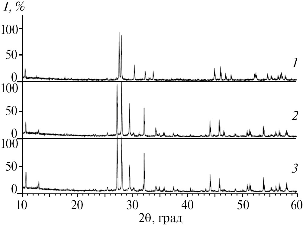 Рис. 1. Рентгенограммы α-KSm(MoO4)2 (1), KSrSm(MoO4)3 (2), KSrGd(MoO4)3 (3).
