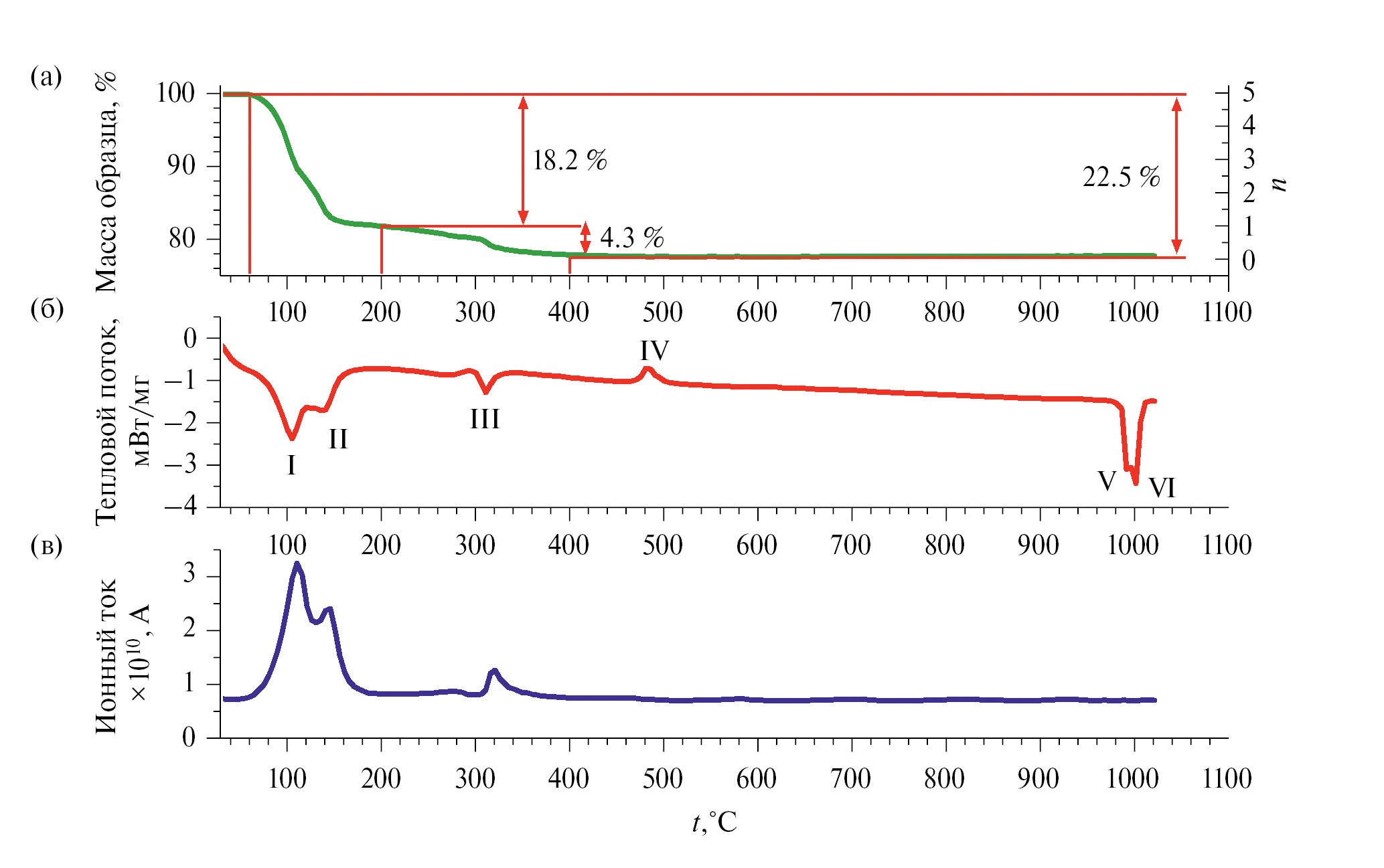 Исследование полученного кристаллогидрата Zn₂P₂O₇ 5H₂O методом СТА (рис. 5) показало, что в интервале от 60 до 400°C происходит полное удаление кристаллизационной воды. Общая убыль массы за время измерений составила 22.5%, что в точности соответствует сорбции паров воды (30% по отношению к исходной массе навески безводного α-Zn₂P₂O₇). Характер кривых ТГ (рис. 5а), ДСК (рис. 5б) и ионного тока (рис. 5в) подтверждает встраивание молекул H₂O в структуру кристаллогидрата и указывает на незначительный вклад поверхностной сорбции паров воды. Кроме того, на основании полученных данных можно заключить, что процесс дегидратации кристаллосольвата протекает в три стадии. Характеристики всех наблюдаемых термических эффектов и их отнесение суммированы в табл. 2. Отметим, что на кривой ДСК (рис. 5б) полностью воспроизвелся двойной эндотермический эффект вблизи температуры плавления Zn₂P₂O₇, наблюдавшийся для исходного вещества – безводного Zn₂P₂O₇ (рис. 2).