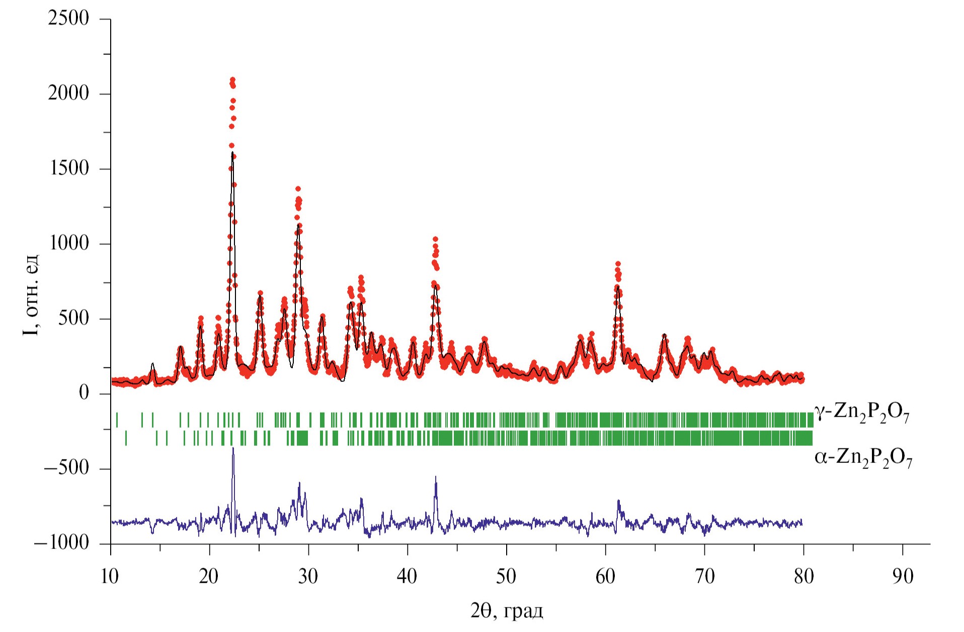 Количественная оценка состава этого образца без учета аморфизованного пирофосфата цинка дает 91 мас.% для γ-Zn₂P₂O₇ и 9 мас.% для α-Zn₂P₂O₇. Таким образом, термообработка кристаллогидрата Zn₂P₂O₇∙5H₂O в интервале 450–500°С не приводит к образованию однофазного γ-Zn₂P₂O₇. В заключение продукт ступенчатых отжигов подвергли термообработке при 600°С (15 ч), в результате чего при охлаждении получили однофазный α-Zn₂P₂O₇.