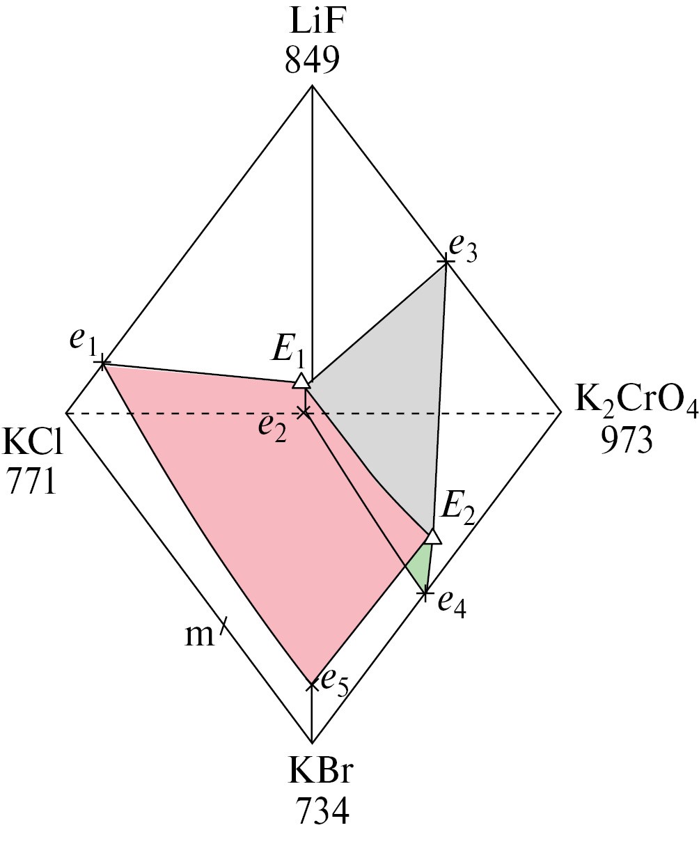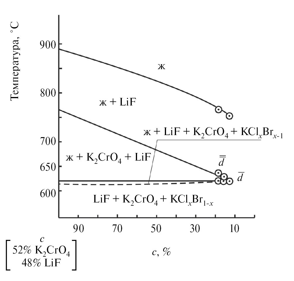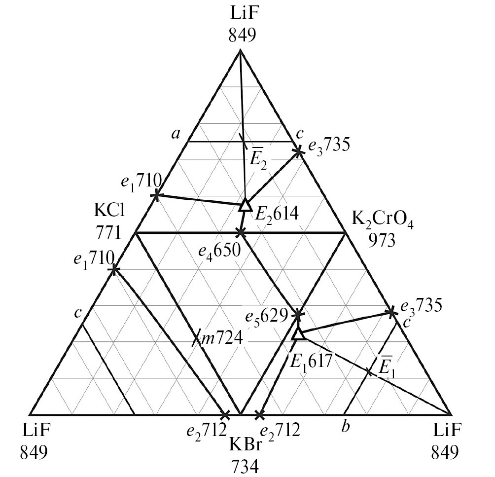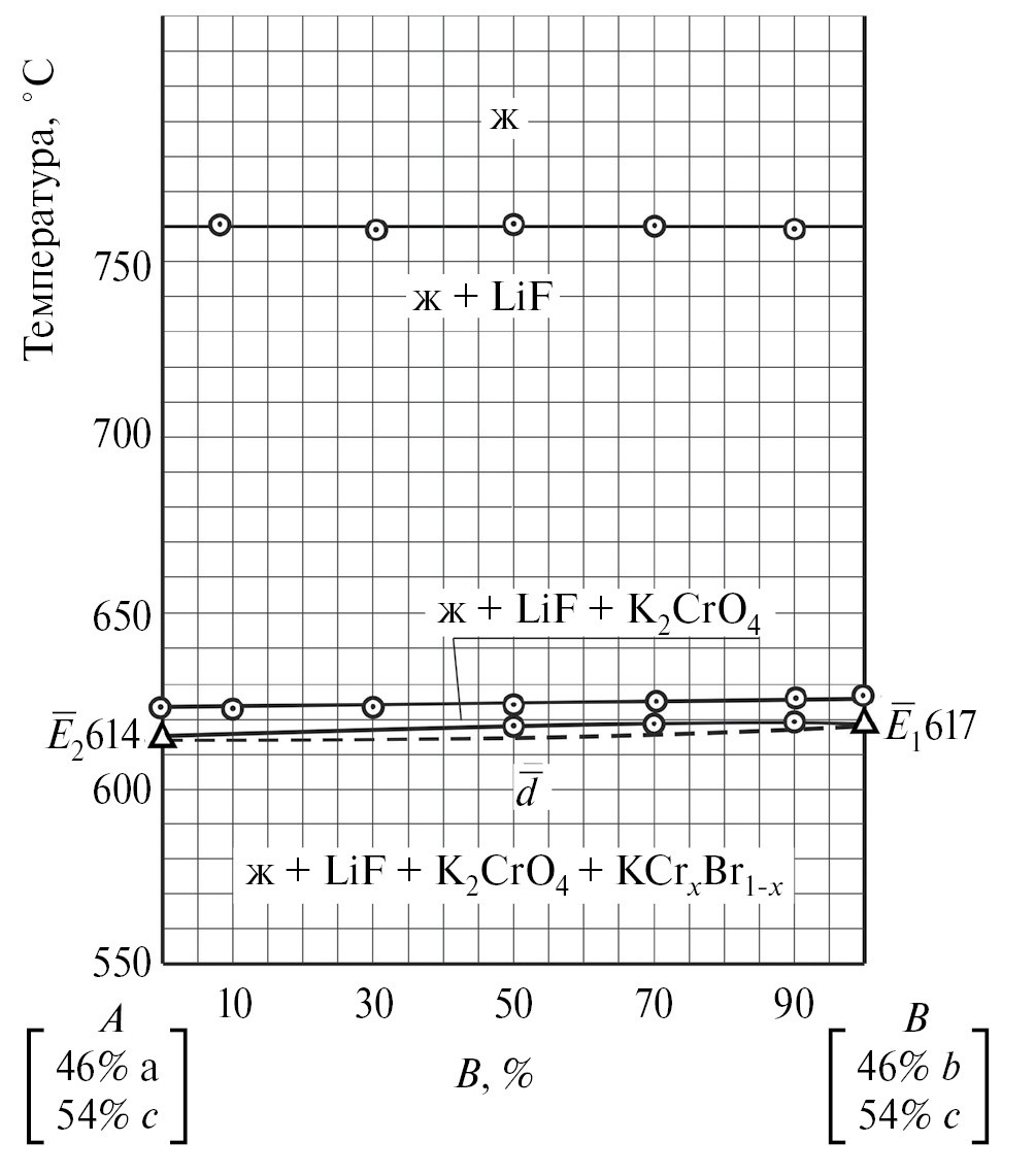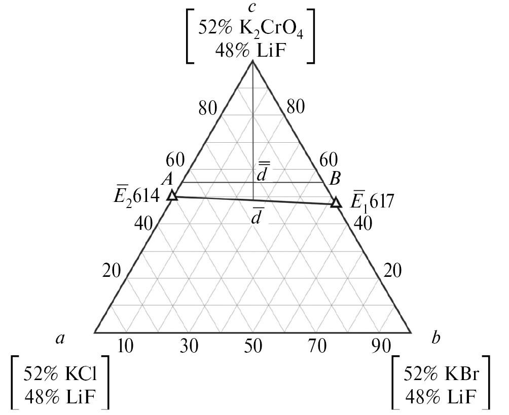 - Система LiF–KBr–K₂CrO₄ содержит эвтектику E1 с температурой плавления 617°С и составом 4% LiF +49.5% KBr + + 46.5% α-K₂CrO₄. В системе зафиксирована кристаллизация трех фаз – LiF, KBr и α-K₂CrO₄ [17].