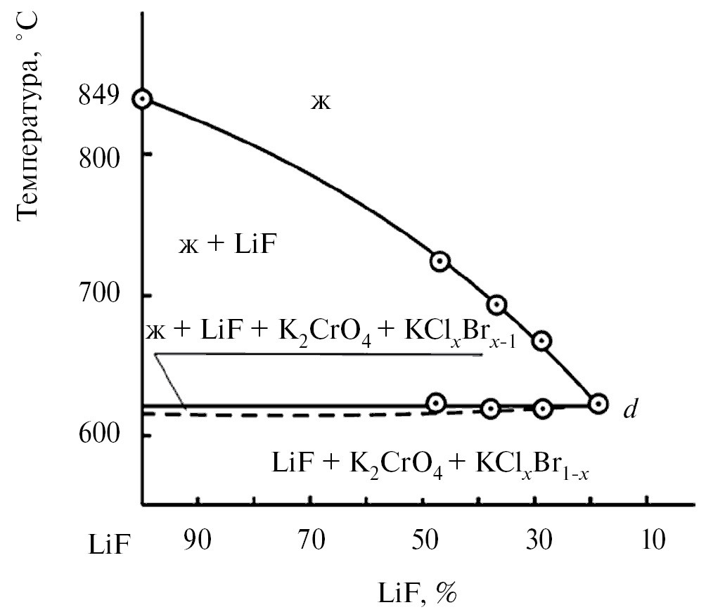Исследованием двух политермических разрезов (рис. 4), LiF (рис. 5) выявили температуру плавления и состав сплава, отвечающего точке d, лежащей на моновариантной кривой E1E2: 616°С, 18% LiF + 42.6% K₂CrO₄ + 19.7% KCl + 19.7% KBr.