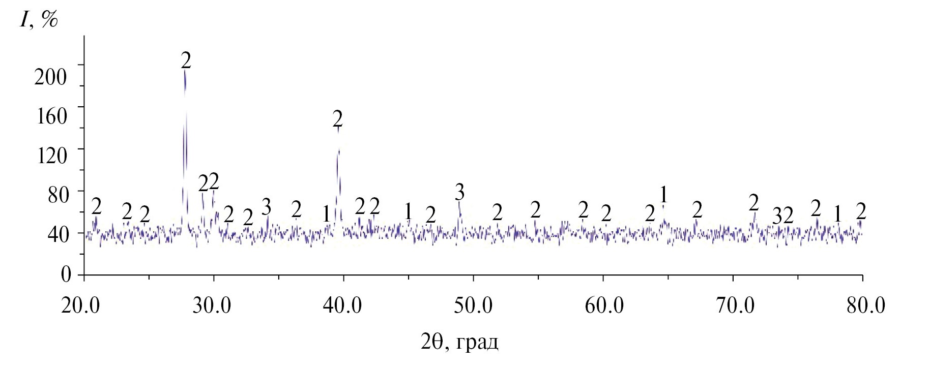 Рис. 6. Дифрактограмма стабильного тетраэдра LiF–KCl–KBr–K₂CrO₄: 1 – LiF, 2 – K₂CrO₄, 3 – НРТР KClₓBr₁₋ₓ.
