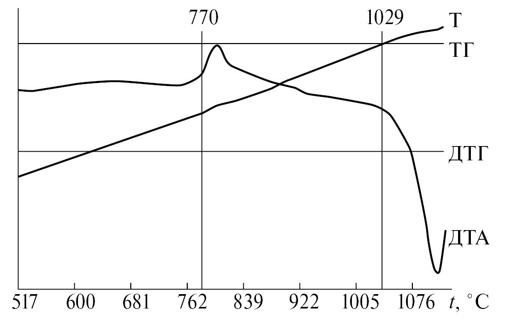 На ДТА-кривой нагрева образца состава 33.3% NaF+66.7% MgF₂ (рис. 3) наблюдается экзоэффект при температуре 770°С, соответствующей температуре начала реакции образования химического соединения: NaF+MgF₂ = NaMgF₃. Далее следует эндоэффект при температуре 1029°С, которая соответствует температуре ликвидуса.