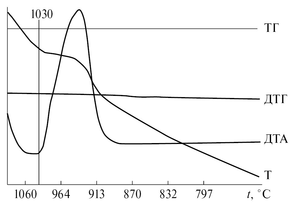 Потеря массы образца незначительна и составляет 0.2%. На ДТА-кривой охлаждения образца состава 33.3% NaF+66.7% MgF₂ (рис. 4) наблюдается один большой экзоэффект, соответствующий температуре кристаллизации соединения конгруэнтного плавления NaMgF₃. Таким образом, экспериментально доказано, что в системе NaFMgF₂ происходит образование соединения конгруэнтного плавления с дистектикой при 1029°С, что подтверждает данные [20].