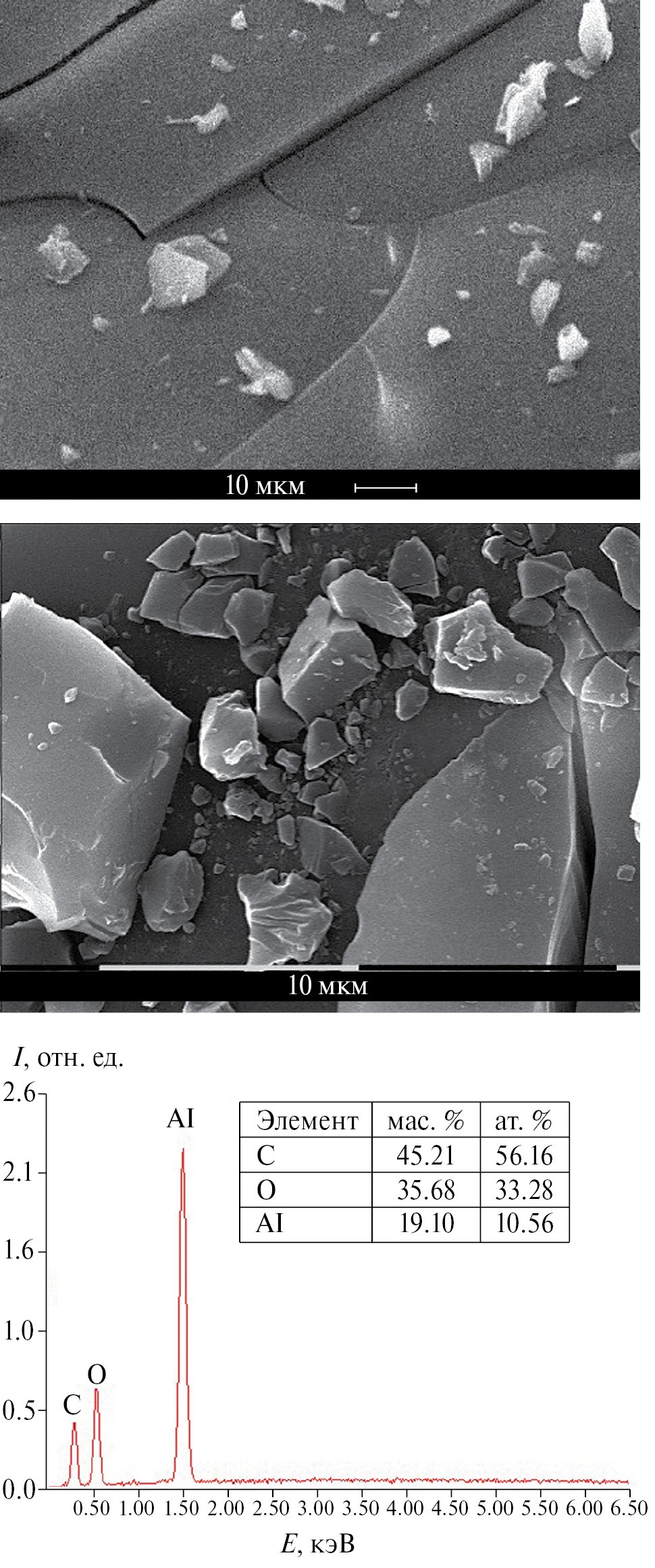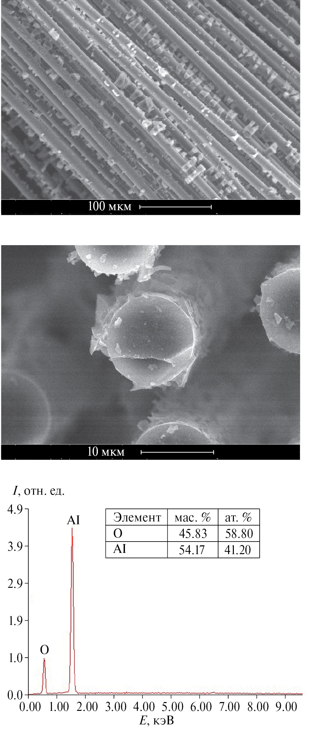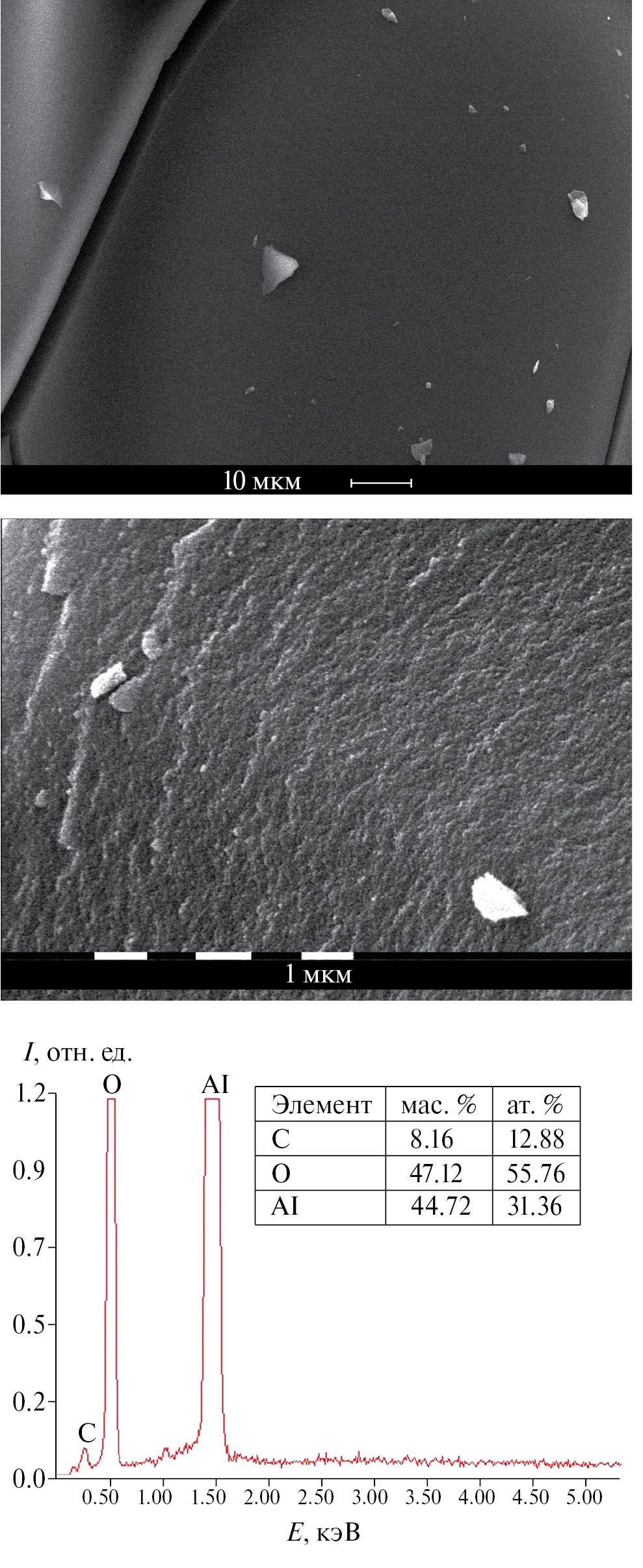 Рис. 1. СЭМ-изображения и данные рентгеновского элементного микроанализа органоалюмоксана.