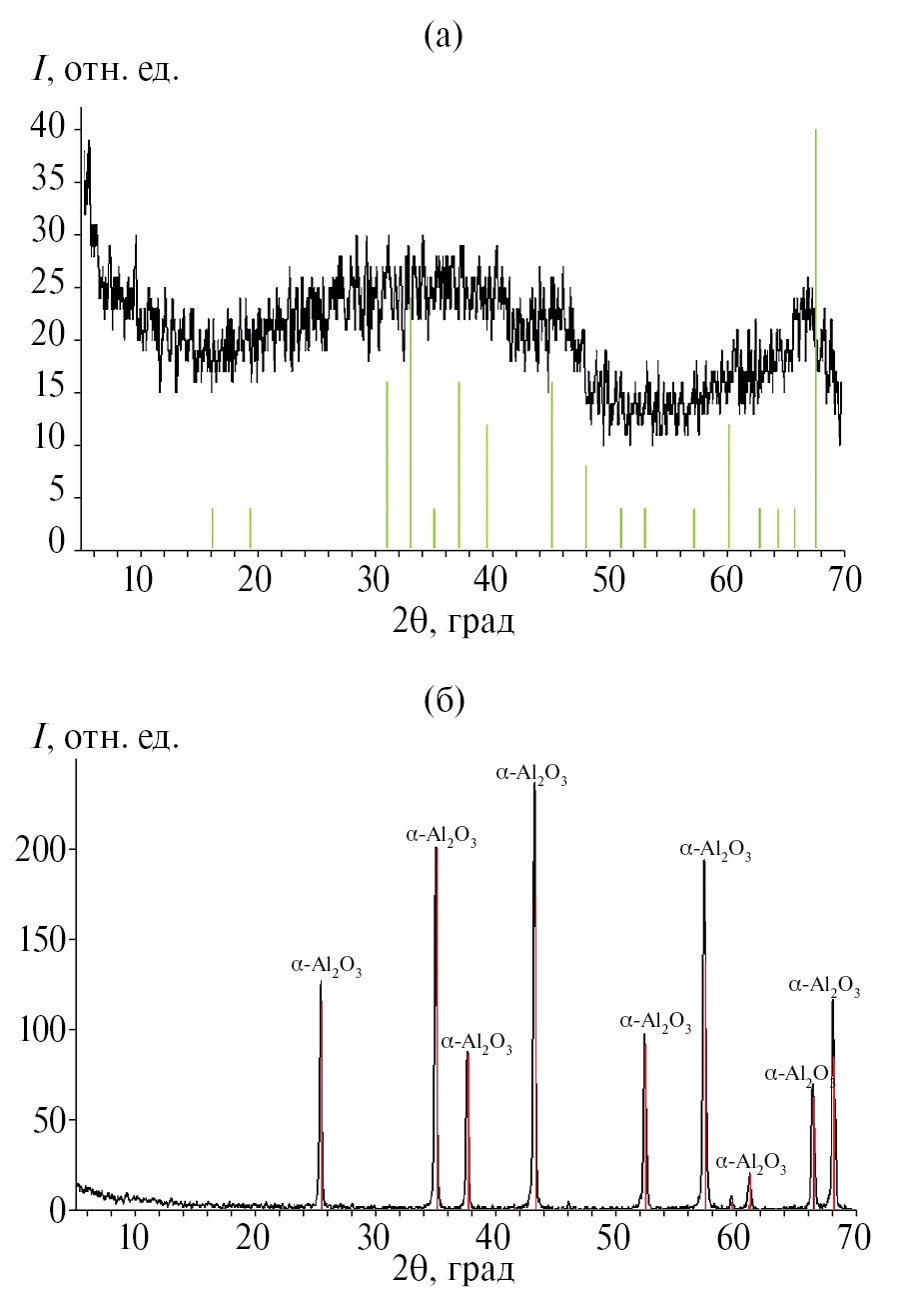 Керамический порошок, полученный в результате пиролиза прекурсора при 700°С, остается рентгеноаморфным (рис. 4а). Пиролиз прекурсора при 1200°С приводит к образованию 100 мас.% корунда α-Al₂O₃ (PDF-2 [74-1081]) (рис. 4б).