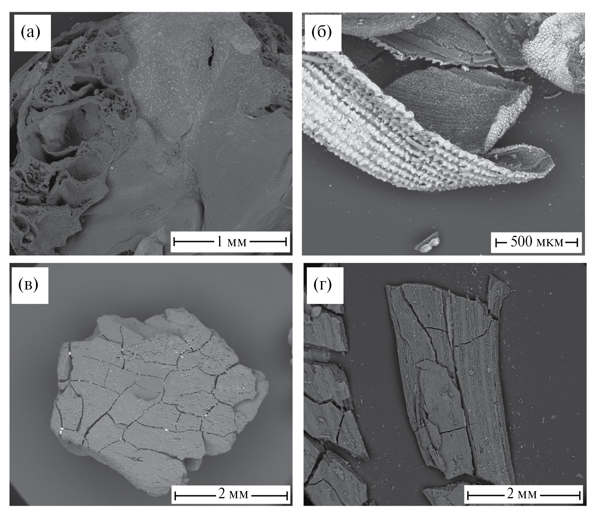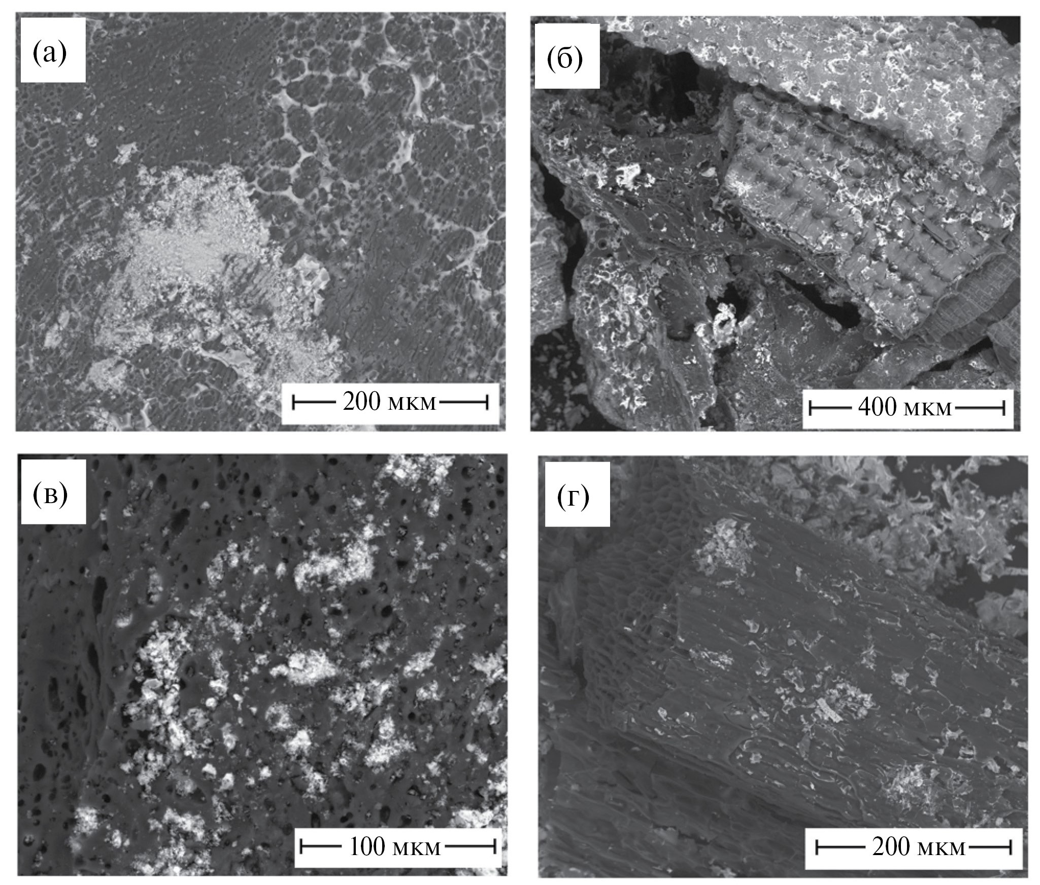 Рис. 2. Микрофотографии изученных биочаров, полученных из горошка (а), шелухи риса (б), скорлупы кокоса (в), лузги подсолнечника (г).