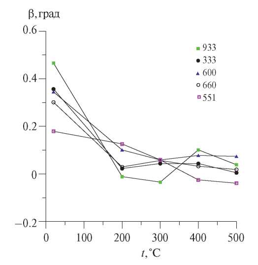 Для выяснения природы структурных превращений в исследуемых соединениях были изучены температурные зависимости ширины дифракционных линий. Из рис. 7 видно, что полуширина линий уменьшается с повышением температуры до ~200°С, затем меняется незначительно. Мы полагаем, что уменьшение ширины дифракционных линий обусловлено ростом ОКР вследствие рекристаллизации образцов, уменьшением дефектности и внутренних деформаций [30].