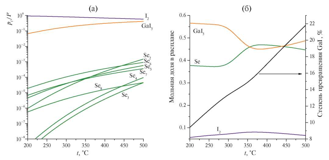 Рис. 1. Термодинамически обусловленный состав паровой (а), конденсированной (б) фаз и равновесная степень превращения GaI3 в Ga2Se3 в системе GaI3–Se.