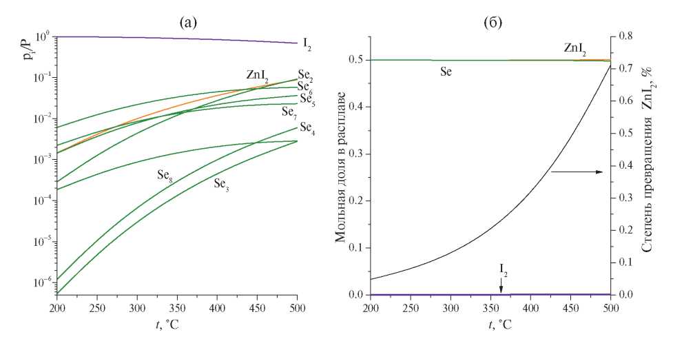 Рис. 2. Термодинамически обусловленный состав паровой (а), конденсированной (б) фаз и равновесная степень превращения ZnI2 в ZnSe в системе ZnI2–Se.