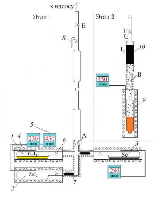 Синтез бинарных селенидов и ZnGa2Se4 проводили на установке, изображенной на рис. 3. Компоненты последовательно загружали испарением в реактор 9, смыкали отводную трубку 8 в пламени горелки и отпаивали установку по перетяжкам А и Б (этап 1). Реактор помещали в вертикальную печь и нагревали до температуры 450°C (этап 2). При повышении температуры наблюдали выделение паров йода, которые конденсировались в необогреваемом приемнике. Это свидетельствовало о начале протекания реакции, которую упрощенно можно записать в виде